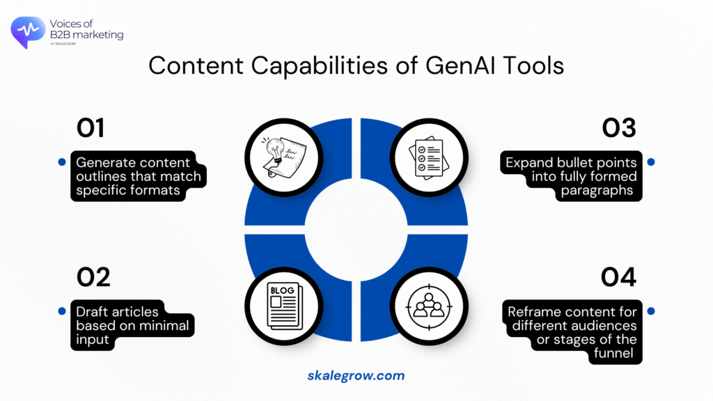 Moreover, GenAI turns every asset into a content hub. A whitepaper becomes five blog posts, a LinkedIn post, a webinar script, and a newsletter. This kind of repurposing ensures message consistency while dramatically increasing content output.